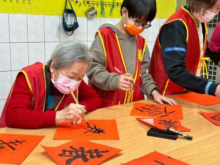 。水餃達人王玉琴帶領長輩小孩一起包水餃,讓孤老感受年節活動的熱鬧也回味兒時回憶,接著大家一起手寫春聯,寫下對今年的期許與祝福,齊聚一堂同樂畫面更有年味,中午時段,由藍天家園的孩子擔任主廚,規劃豐富菜色讓長輩在年前大飽口福,加上上午眾人一起包的水餃,吃一頓滿滿的回憶。