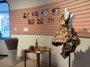 此次展出10件作品,涵蓋藺卵石、許願盒,及各式生活物件如花器、手提包、睡枕、櫥櫃等。特別展出剛榮獲「2025台灣藺草創作獎」第一銀行特別獎的作品《一襲織地》(涂苡庭創作),以藺草為載體,將苑裡田畝肌理與河流紋樣編織進衣裝中,隱喻土地與文化傳承的流動感,讓讀者近距離感受藺草從自然材料轉化為藝術織品的精湛工序。