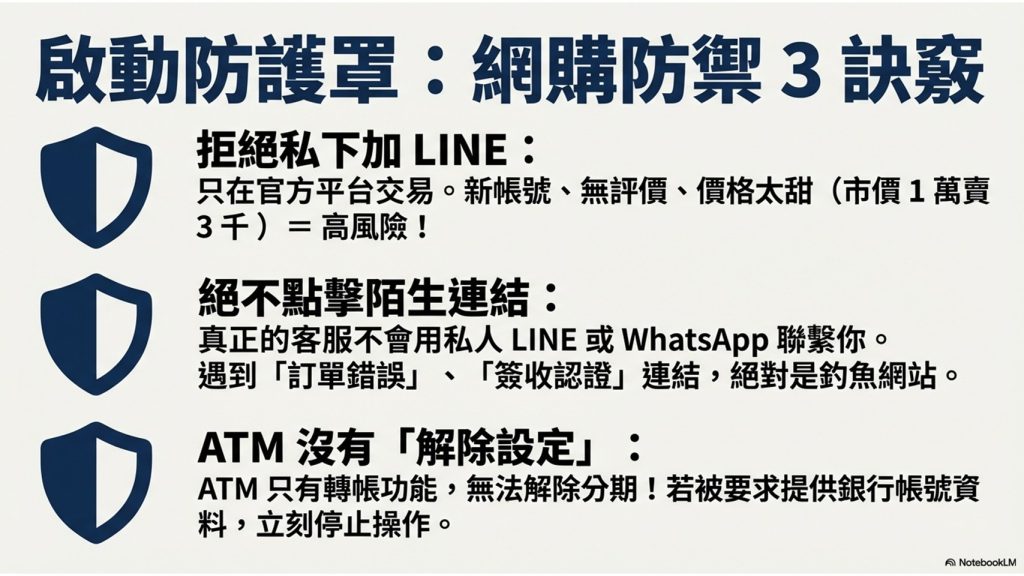 林鼎泰提醒,大學生在網購或網路交友時務必提高警覺,拒絕私下加LINE、不要點擊陌生連結,也不要提供銀行帳戶或提款卡資料;並特別強調ATM沒有「解除設定」功能,若有人要求提供OTP簡訊驗證碼,幾乎就是詐騙。若遇疑似詐騙情形,請牢記「冷靜、停止操作、撥打165查證」,共同守護自身財產安全。