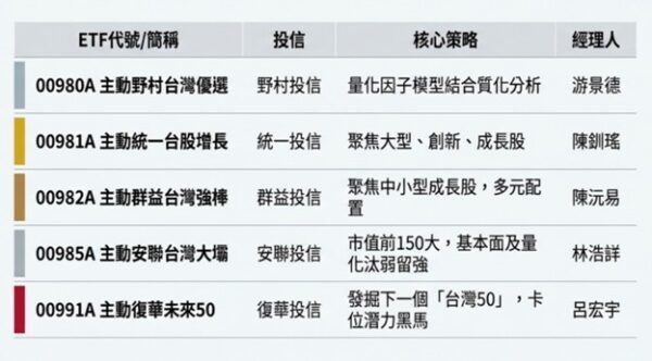 今年是國內主動式ETF元年,台股主動式ETF戰場競爭尤其激烈,已掛牌上市交易的5檔分別由野村、統一、群益、安聯等四家投信發行,緊接著年底前還將有復華、台新、第一金等投信首度加入戰場,台股主動ETF可謂盛況空間,不過除了投信品牌之外,最讓基金醫生津津樂道的是主動式ETF基金經理人的各顯神通!尤其是00980A、00981A以及即將掛牌的00991A的天王天后之爭!