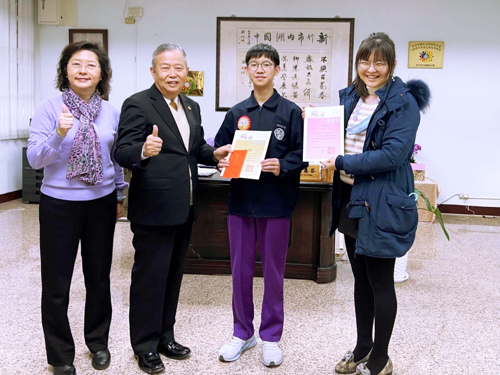 ▲普仁新竹區會長高傳鑑(左2)到內湖國中,在學校師長陪同下,頒獎給得獎小太陽楊順星(右2)。(圖/靈鷲山佛教教團提供)
