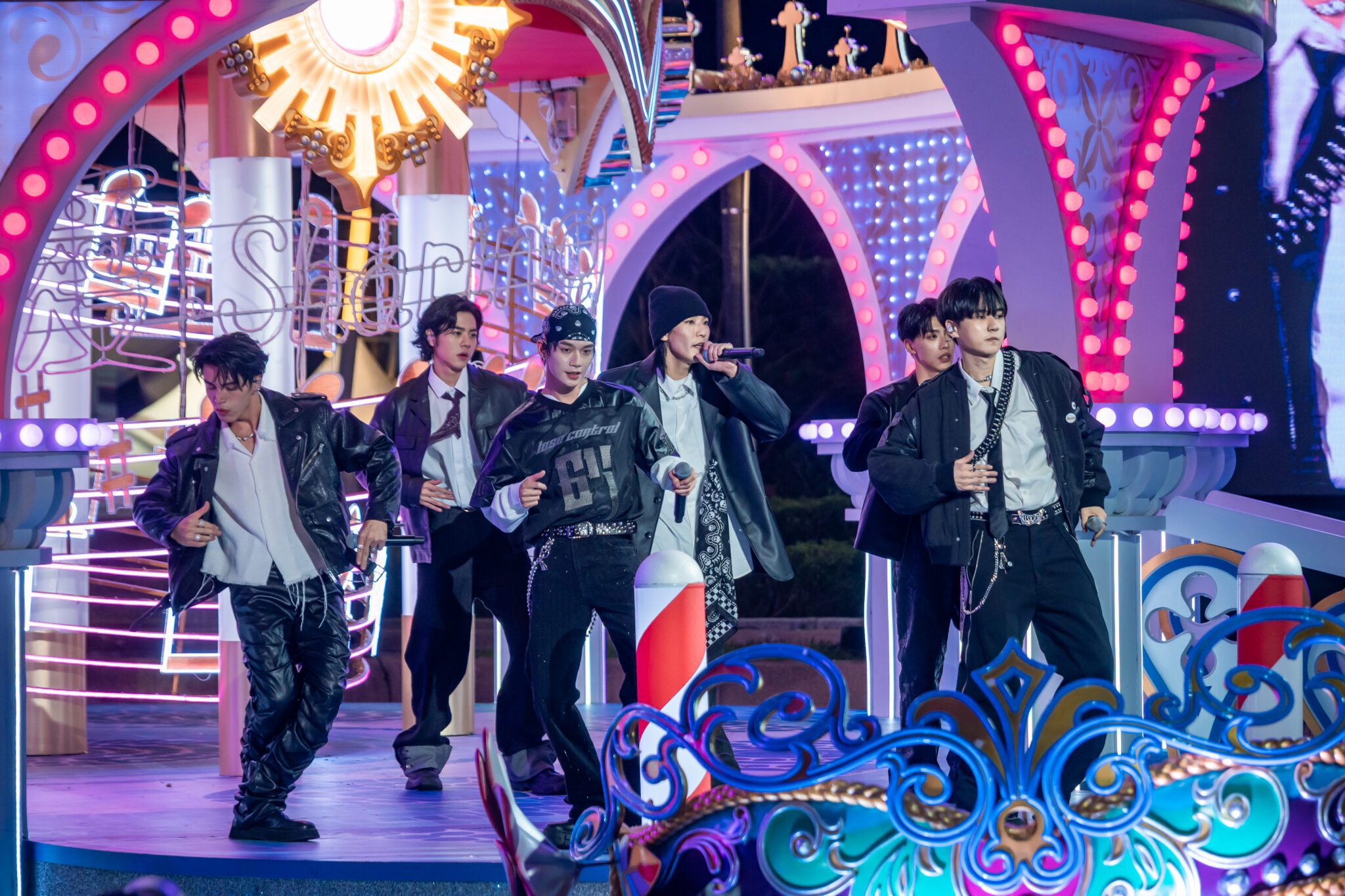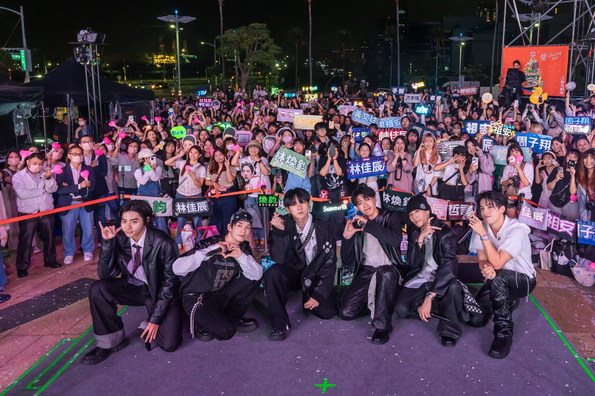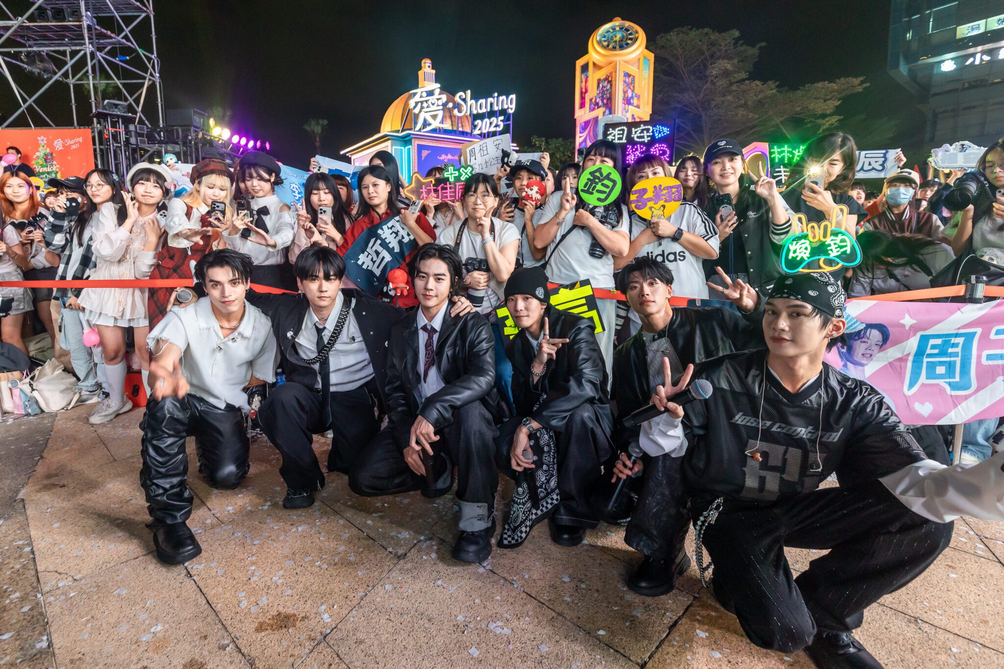 而在南台灣的高雄夢時代,人氣男團Ozone同樣掀起熱潮。六位成員以帥氣造型登場,帶來多首人氣舞曲,搭配燈光、雷射特效,瞬間讓現場變成熱情奔放的嘉年華會。成員們也在訪談中透露對《愛‧Sharing》的熟悉感與期待:「去年『倫敦』的主題非常夢幻,彷彿真的置身英國,各種場景都讓我們想拍照打卡。這次能親自成為活動的一部分,真的很開心。」說到今年的「水都威尼斯」,團員們笑說:「想到威尼斯就會聯想到運河、船伕、還有面具節那種神秘又華麗的氣氛。我們很好奇這次現場的聖誕裝置會怎麼呈現,像聖馬可廣場那樣壯麗的場景、閃閃發光的水上裝置或浪漫拱橋,一定超夢幻!」