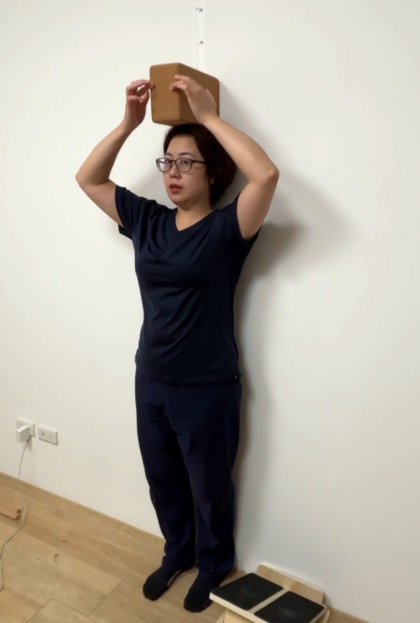 因示範治療動作,每日練習胸椎擴展、核心啟動、筋膜鬆動,再加上呼吸、睡眠與徒手治療介入後:身高從 162 → 164 → 164.5~165 cm。