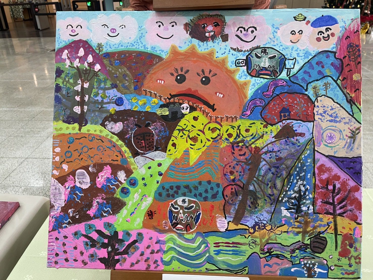 這幅畫是一個充滿色彩與快樂想像的世界。畫面中有各式各樣的臉譜和好玩的面具,代表不同的表情與心情。/ 圖 以上六幅作品都是由17位精忠育幼院院生、老師及10多位屏科大社工系學生一起共同創作的。
