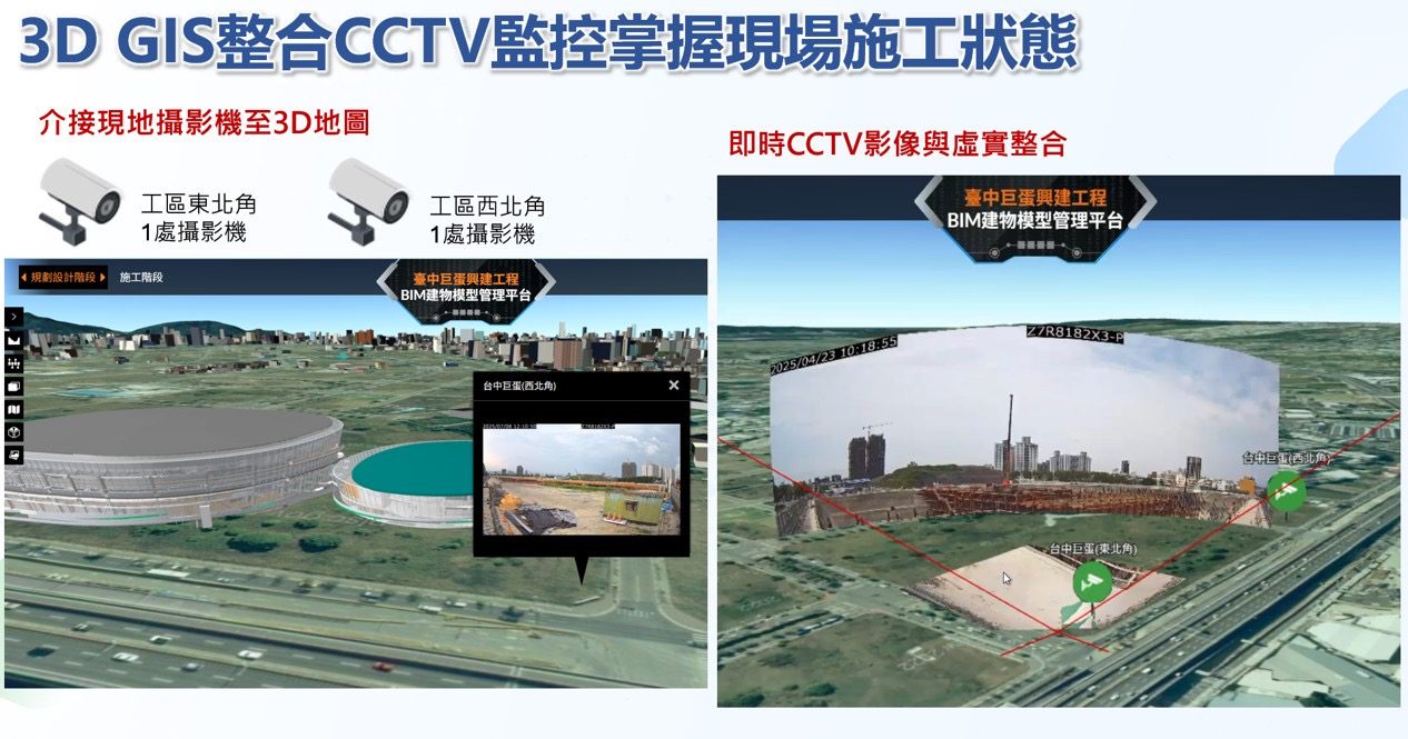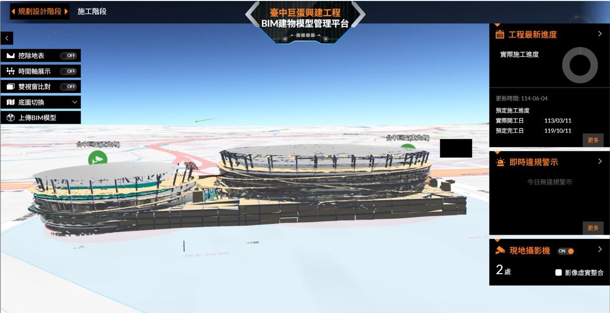 陳局長表示,此次與國研院國網中心合作,結合地理資訊系統(GIS)與建築資訊模型(BIM),並導入數位孿生、人工智慧及AI影像辨識等新技術,成功建置三維GIS資訊系統,以三維視角即時呈現場館結構、施工進度及智慧安防資訊,讓工程執行進程與建築模型成果一目了然。台中巨蛋工程規模龐大、工項複雜,是新技術驗證的最佳示範場域,不僅可驗證智慧科技於實務上的可行性,也能透過數位模擬方式「看見未來巨蛋」,協助建設團隊精準掌握工程進度、控管安全風險,進而提升整體工程管理效益與決策效率。