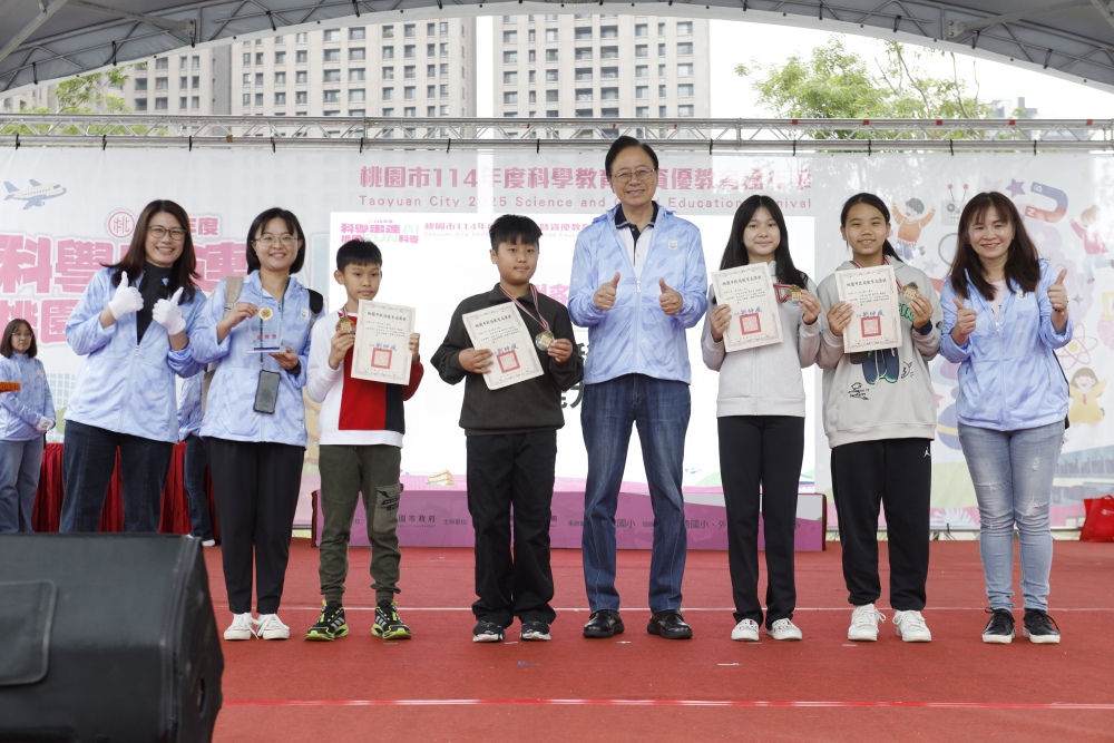 桃園市市長張善政更親臨現場,表揚本市文昌國中學生蕭睿希參加2025年「第22屆國際國中科學奧林匹亞競賽(IJSO)」榮獲金牌獎的佳績,以及參與本市水火箭比賽及國小科學基本能力競賽的獲獎團隊,勉勵師生在實作與挑戰中持續精進。期盼透過科學教育的扎根,引導孩子掌握未來科技趨勢,培養能與世界接軌的能力,以科技改善生活、以創新擘劃未來,而今日嘉年華正是本市人才培育與教育能量的重要展現。
