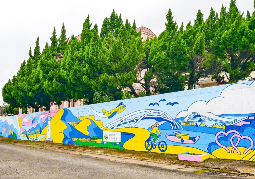 以「桃園珍珠海岸特色,自然共生地方敘事」為核心理念,串聯四區在地特色為主軸,從左至右依序融入桃園珍珠海岸CIS Logo海洋意象,經沿岸到平原以及延伸至丘陵,元素包含觀音區的風箏衝浪、白沙岬燈塔、草漯沙丘、水之丘主題公園,新屋區永安漁港海螺文化體驗園區、生態藻礁與石滬,大園區許厝港濕地、沿岸自行車道、桃園航空城飛機,蘆竹區特色埤塘以及維多利亞民宿所在丘陵森林內動植物如穿山甲、藍腹鷴、松鼠與「兔子」等作為意象,營造童趣又溫暖的氛圍,兔子們在樹林間奔跑、玩耍,穿山甲與藍腹鷴點綴於畫面之中,象徵生態活力與地方純樸的自然風貌,展現多元物種共存的生命力。整體牆設計既展現桃園沿海豐富的景觀特色,也呼應業主期望的專屬意象,體現桃園珍珠海岸在自然、生態與人文之間的平衡共生。