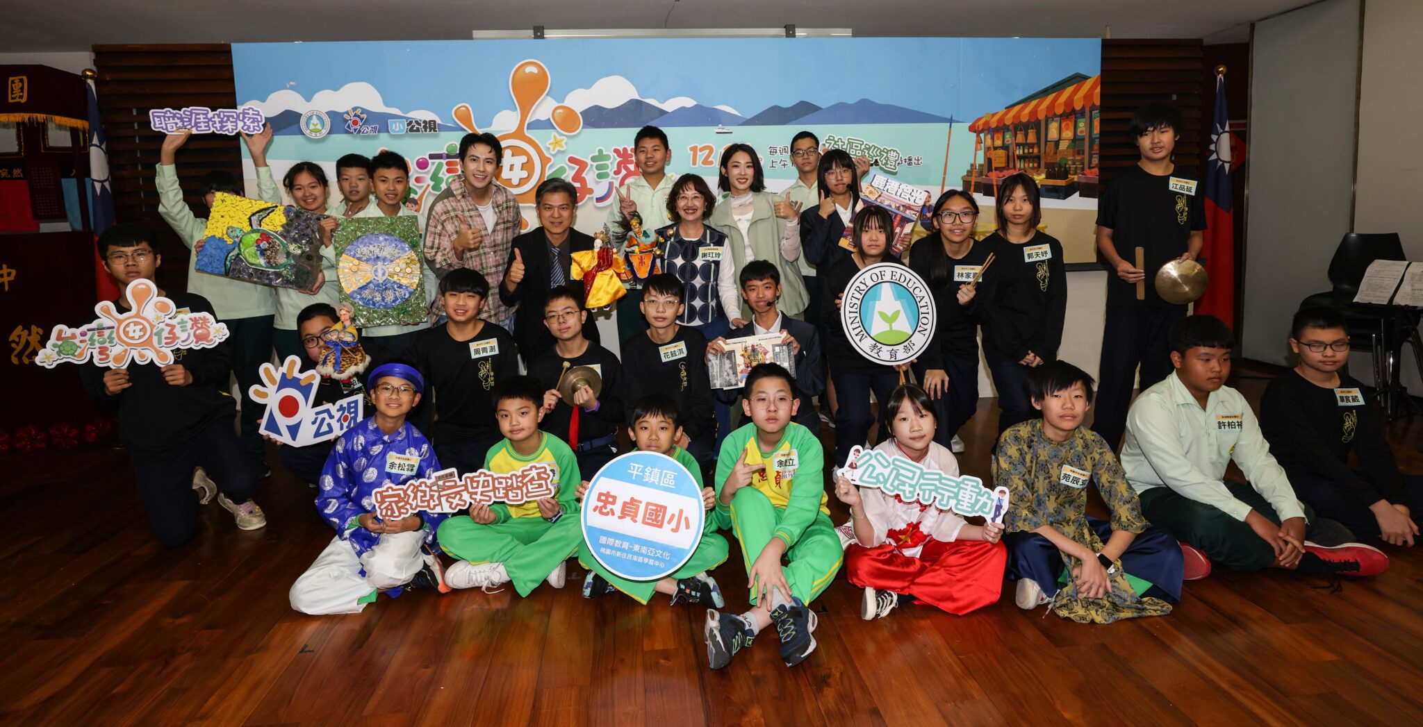 潘君侖(後排左五起)教育部彭富源署長、公視謝玒玲副總(後排左八起)林思宇及三芝國中、望安國中、忠貞國小、鹿江國際國中小的師生共同出席記者會   公視《台灣囡仔、讚!》提供