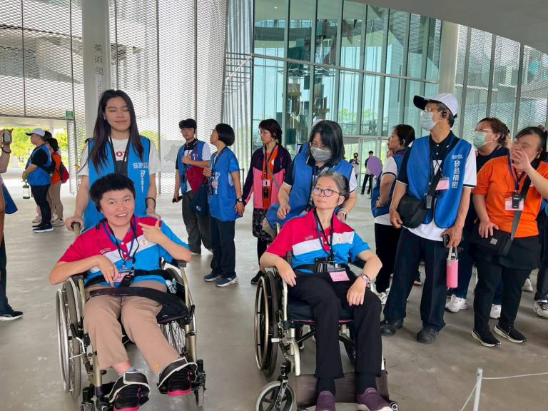 ▲這次活動由矽品志工主動擔起陪伴重任,從推行輪椅、引導參觀動線,到協助器材預備,透過分組搭配與貼身協助,讓智青能安心置身於藝術空間遊賞。(圖╱瑪喜樂基金會提供)