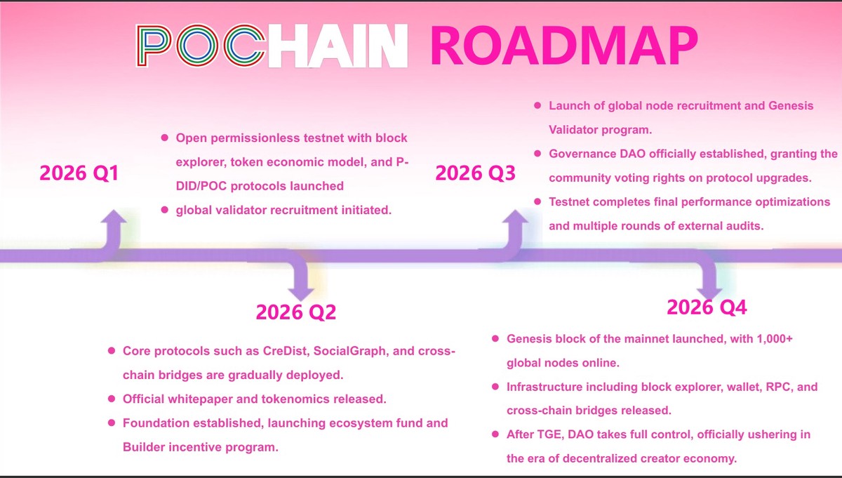 • POChain:專為 Web3 創作者與開發者量身打造的,一條獨立運行、擁有完整主權的 AIGC 數位內容 L1 公鏈,在 EVM 層與 BNB Chain 完全相容,致力於構建針對內容創作的新一代基礎設施。由 MEETLabs 和 MEET Foundation 聯合孵化,搭建 MEET48 官方代幣 $IDOL 與公鏈原生代幣 $POC 的兌換池,用於承接早期 $IDOL 投資價值,按時間與生態里程碑,分階段、有限度地向公鏈原生代幣 $POC 轉化。POChain 生態將在 2026 年根據發展藍圖(Roadmap) 陸續發布上線以下產品: