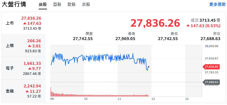 台積電週二(21日)攀高至1500元,帶動權值、高價股紛紛走高,激勵台股盤中大漲逾200點,再刷27969點新高紀錄,距離2萬8點僅一步之遙,盤面熱門族群活蹦亂跳,被動元件、功率半導體、矽晶圓等族群輪番上場,預估成交量約6400億元。