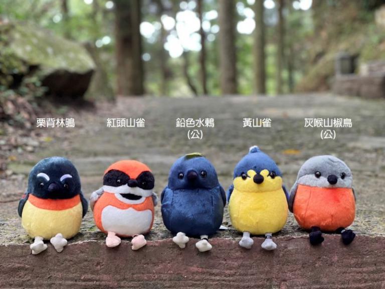 這五隻手掌大的布偶鳥,分屬於五處國家森林遊樂區場域的特色鳥類,內洞國家森林遊樂區的鉛色水鶇,常立於溪石之上,公鳥鮮紅色尾羽輕輕張開,上下擺動,宣示領域。滿月圓國家森林遊樂區的灰喉山椒鳥,秋冬季節在闊葉林上層常見成群活動,雄鳥鮮豔的橘色腹羽宛如飛舞的秋葉。拉拉山國家森林遊樂區的黃山雀,牠們的冠羽如英俊的龐克頭,配上鮮黃的腹部,是森林中最耀眼的住客。東眼山國家森林遊樂區的紅頭山雀,棲息於中海拔的山區闊葉林或針葉混合林,經常群體於東眼山林間樹冠層見著靈巧覓食的身影。觀霧國家森林遊樂區的栗背林鴝,雄鳥擁有鮮亮的白色眉紋和橘紅環紋,背部深灰黑色,如時尚達人般引人注目。