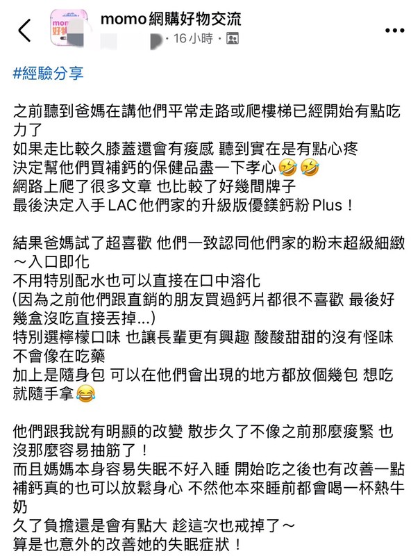 她爬文比較多款產品後,最後選擇入手 LAC 升級版優鎂鈣粉 Plus,沒想到爸媽一試成主顧。原PO表示,這款粉末的細緻度高,用舌頭就能在口中直接化開,不需要吞大顆藥片,也不用特別配水,長輩接受度瞬間提升。她提到過去爸媽曾買過直銷鈣片,因為太難吞、味道不佳,最後幾盒都直接擺到過期,這次找到能入口即化的粉末可說是徹底解決困擾。