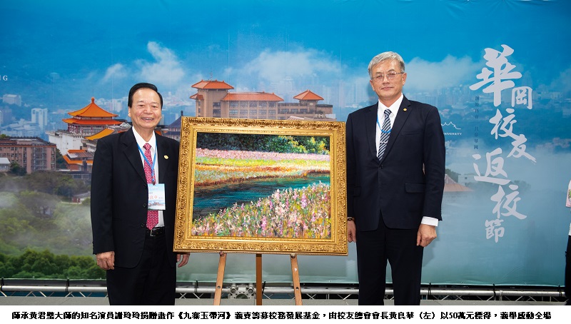 甫獲文化大學名譽博士、師承黃君璧大師的知名演員謝玲玲,特別捐贈畫作《九寨玉帶河》義賣籌募校務發展基金,由校友總會會長黃良華以50萬元標得,義舉感動全場。謝玲玲學姐長年關心母校發展,展現藝壇名家對華岡的深厚情誼。